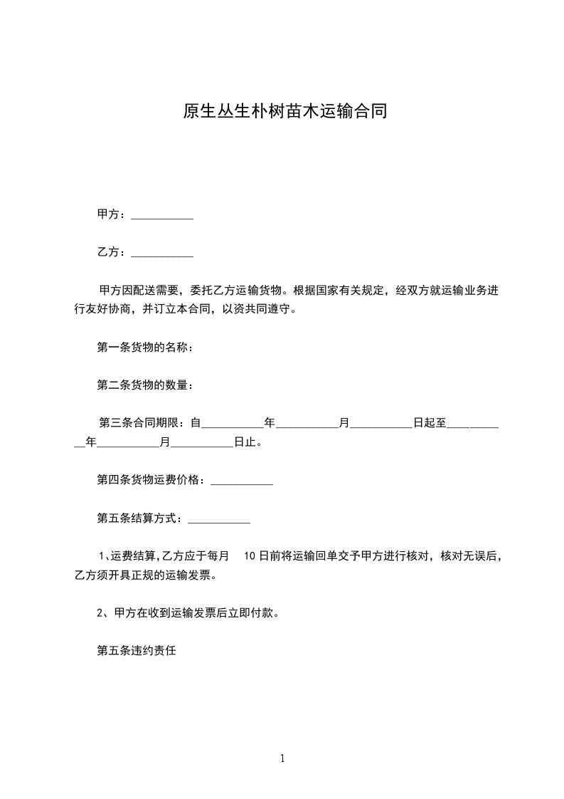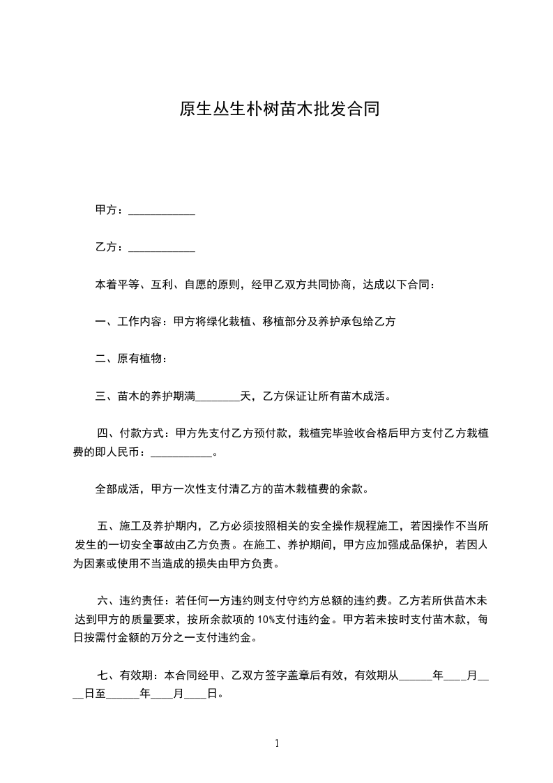 六、违约责任:若任何一方违约则支付守约方总额的违约费。乙方若所供苗木未达到甲方的质量要求,按所余款项的10%支付违约金。甲方若未按时支付苗木款,每日按需付金额的万分之一支付违约金。