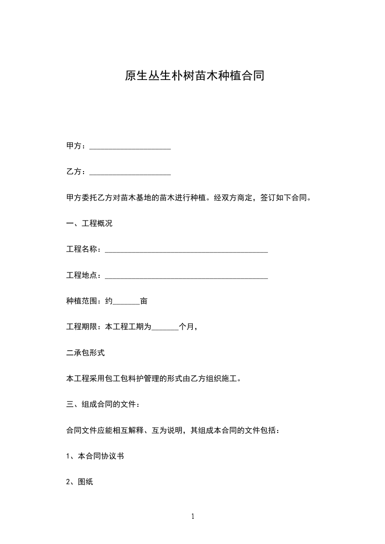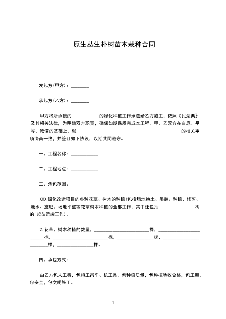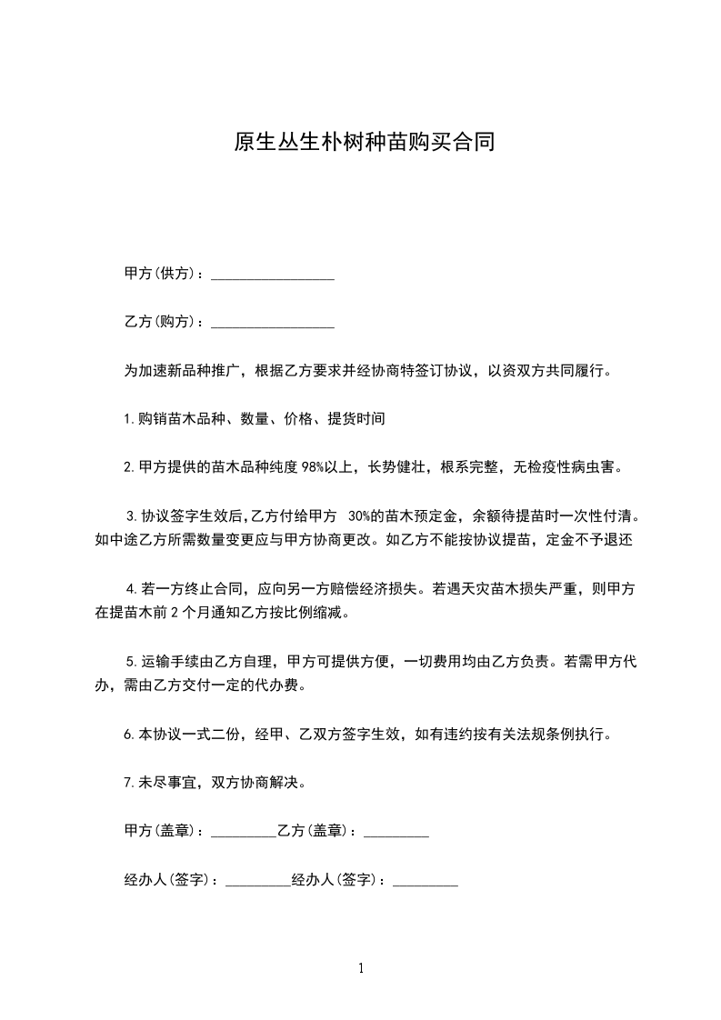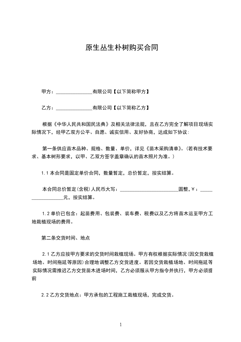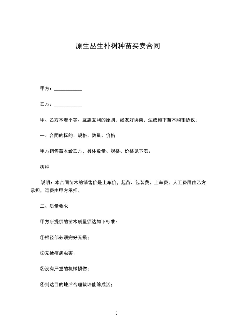 原生丛生朴树苗木批发合同
