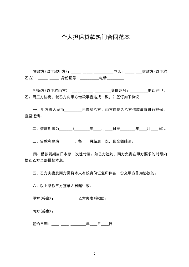 一、甲方将人民币_________元借给乙方,丙方自愿为乙方借款事宜进行担保,直至还清。