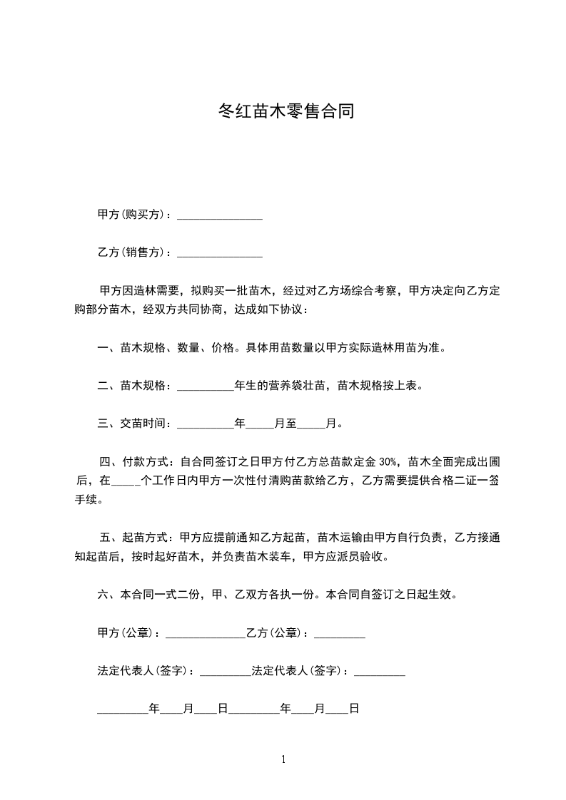 五、起苗方式:甲方应提前通知乙方起苗,苗木运输由甲方自行负责,乙方接通知起苗后,按时起好苗木,并负责苗木装车,甲方应派员验收。