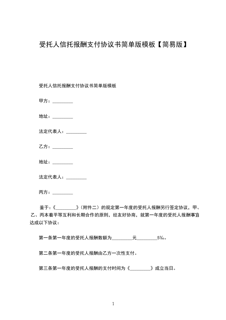 鉴于:《_________》(附件二)的规定第一年度的受托人报酬另行签定协议,甲、乙、丙本着平等互利和长期合作的原则,经友好协商,就第一年度的受托人报酬事宜达成以下协议: