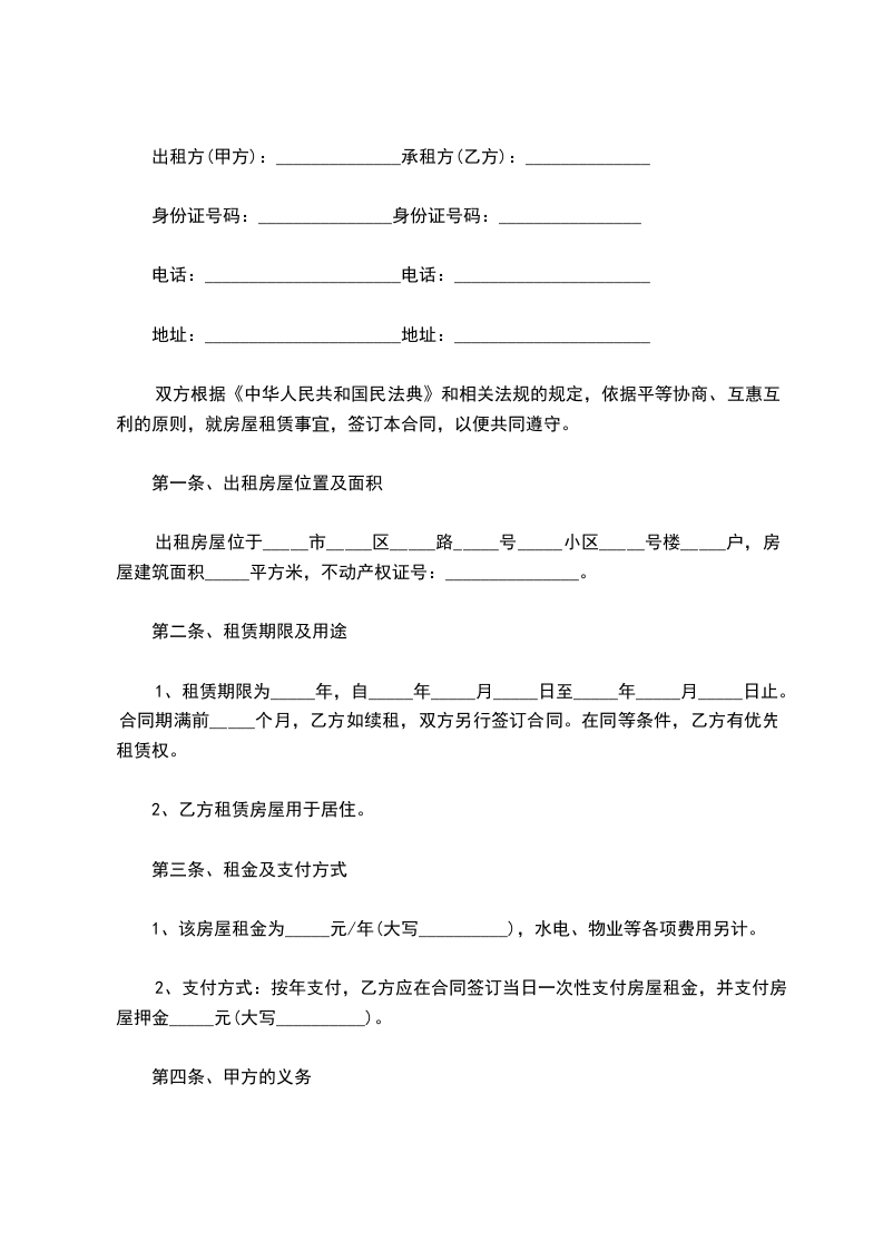 1、租赁期限为_____年,自_____年_____月_____日至_____年_____月_____日止。合同期满前_____个月,乙方如续租,双方另行签订合同。在同等条件,乙方有优先租赁权。