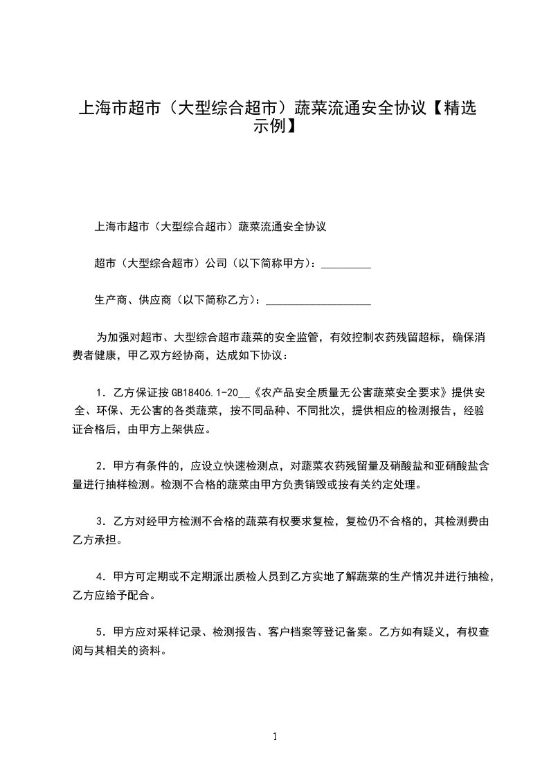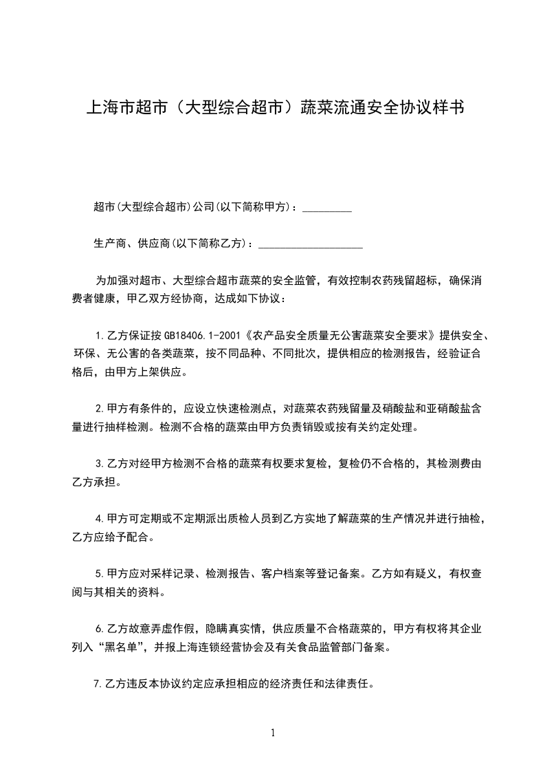 上海市超市(大型综合超市)蔬菜流通安全协议样书