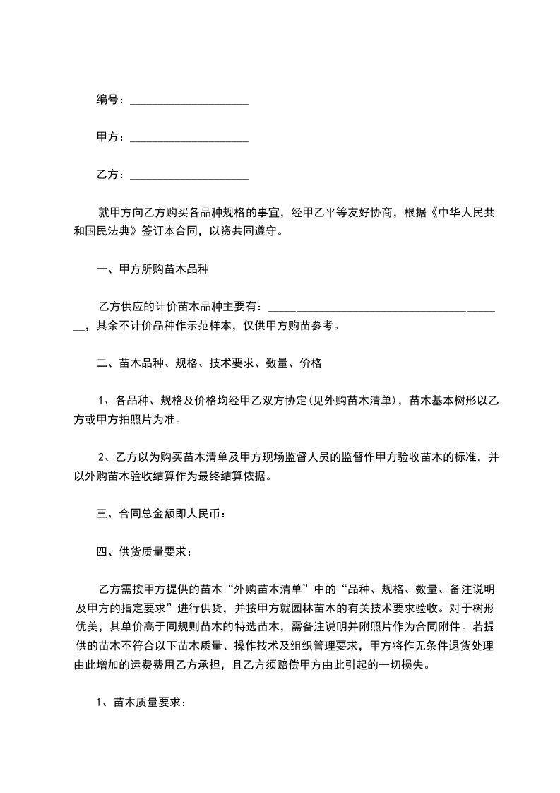 一、甲方向乙方采购苗木_______株,金额为人民币________.甲方与乙方按实际采购苗木数量,按实结算。