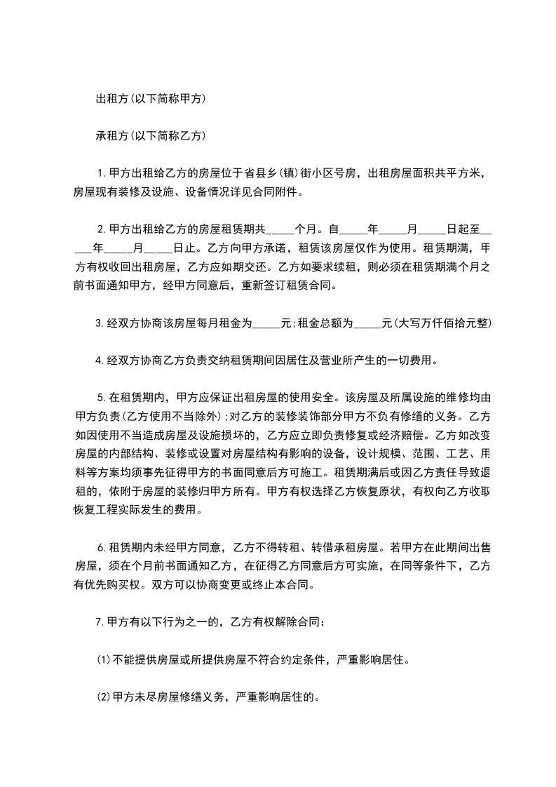 九、解除本合同的条件甲、乙双方同意在租赁期内,有下列情形之一的,本合同终止,双方互不承担责任: