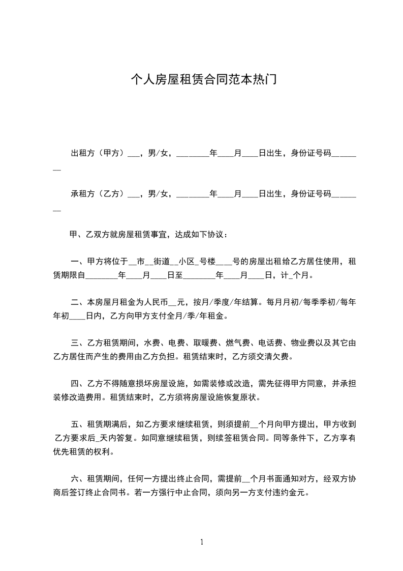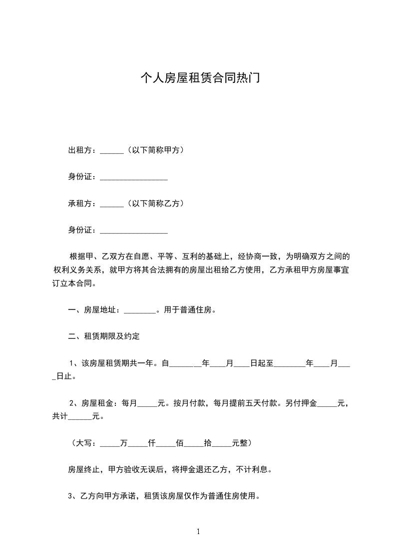 合同编号:_________出租方(甲方)_______身份证号码:_____ _______承租方(乙方)_______身份证号码:_____ _______根据《民法典》、《____市房屋租赁条例》(以下简称:《条例》)的规定,甲、乙双方在平等、自愿、公平和诚实信用的基础上,经协商一致,就乙方承租甲方可依法__________出租的__________房屋事宜,订立本合同。