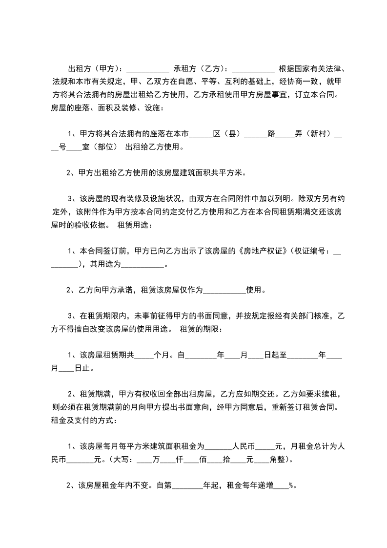 2、租赁期满,甲方有权收回该房屋,乙方应如期返还。乙方需继续承租该房屋的,则应租赁期满前______个月,向甲方提出续租书面要求,经甲方同意后重新签订租赁合同。
