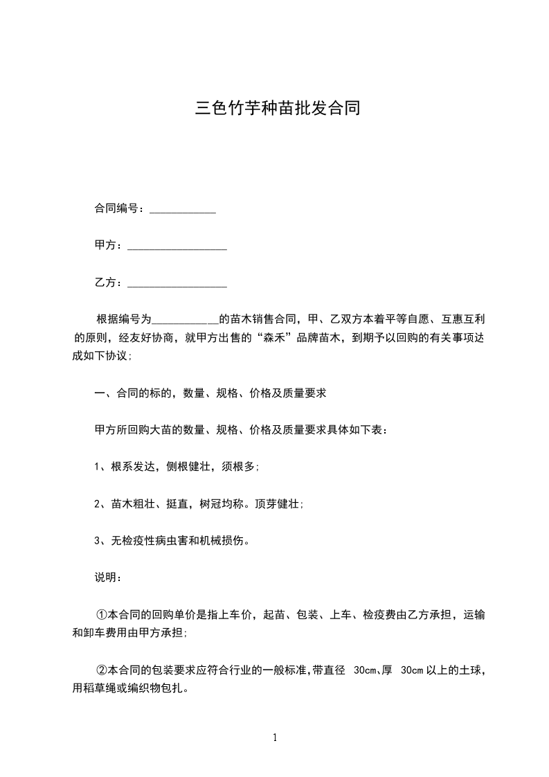 一、甲方向乙方采购苗木_______株,金额为人民币________。甲方与乙方按实际采购苗木数量,按实结算。