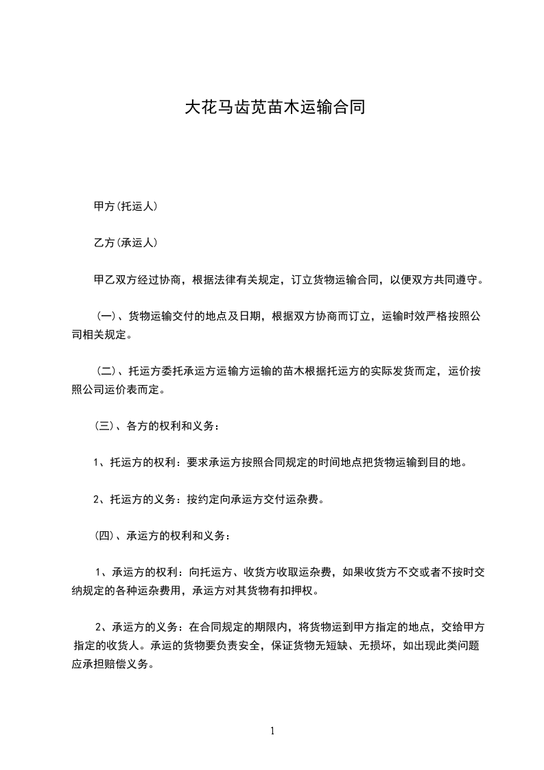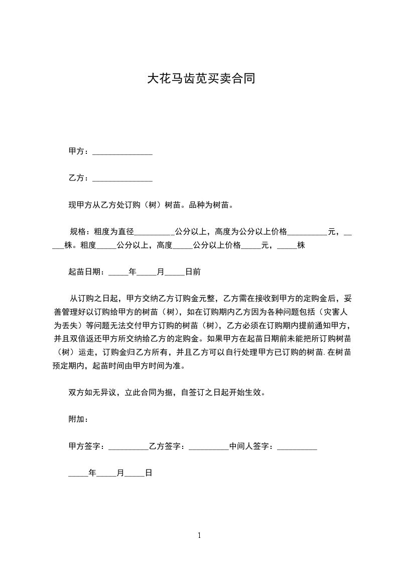 一、甲方向乙方采购苗木,具体的苗木品种、规格、单价等见本合同附件(苗木采购确认表)所列内容。本合同总价为人民币______________元。如遇甲方场地受限等原因不能全部种植,经双方协商,乙方需按甲方实际需要苗木数量进行供苗,按实结算;多出部分甲方有权不予接收或退还,由乙方自行处理。