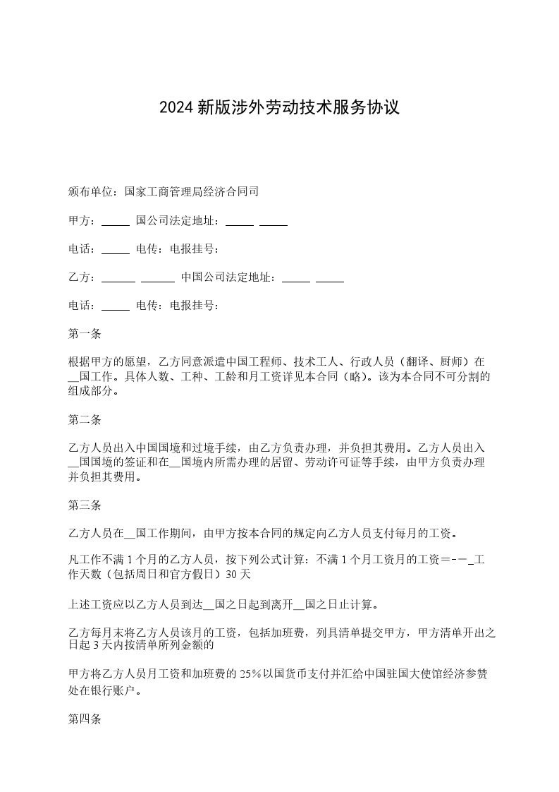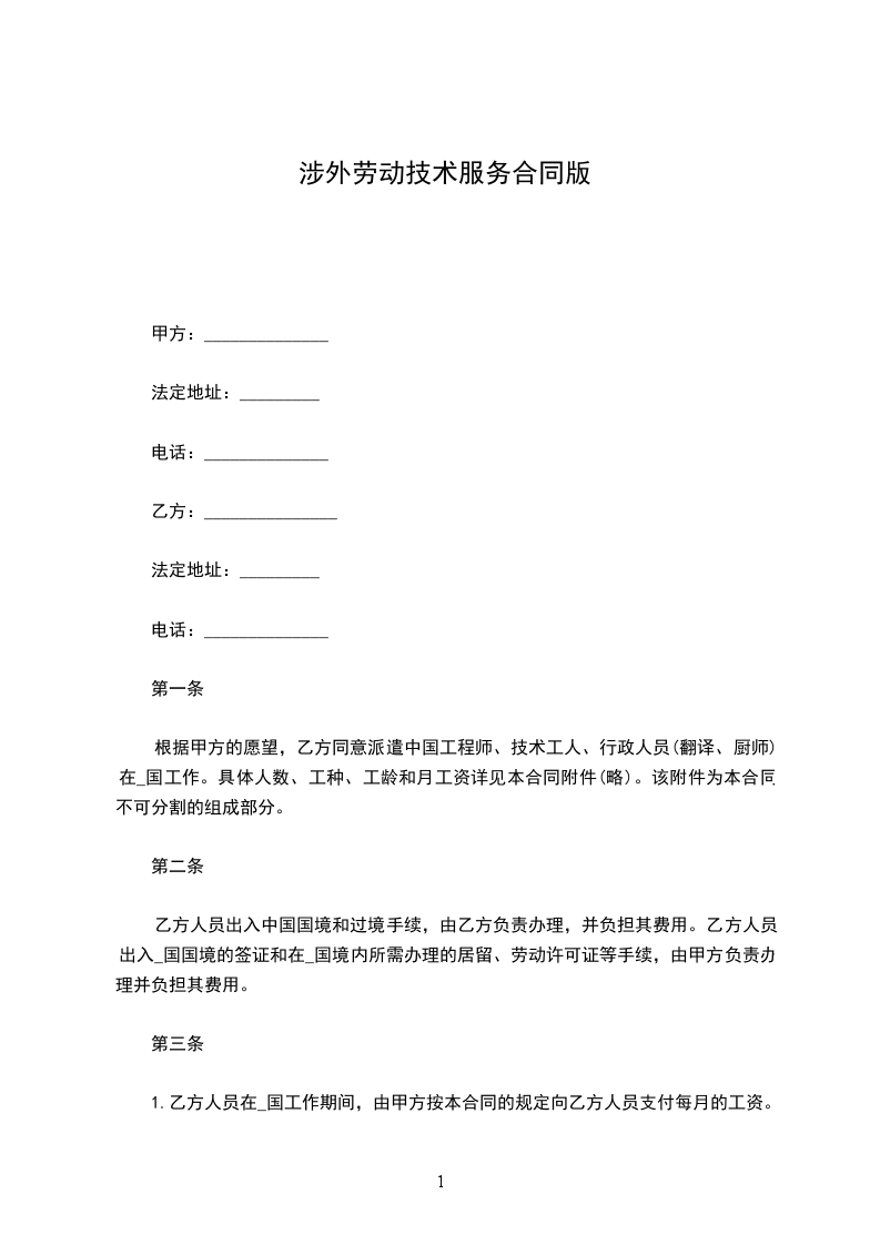 根据甲方的愿望,乙方同意派遣中国工程师、技术工人、行政人员(翻译、厨师)在_国工作。具体人数、工种、工龄和月工资详见本合同(略)。该为本合同不可分割的组成部分。