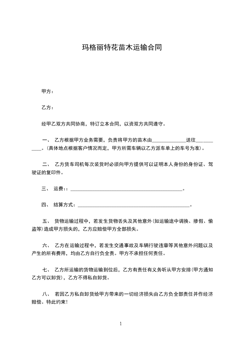五、起苗方式:甲方应提前通知乙方起苗,苗木运输由甲方自行负责,乙方接通知起苗后,按时起好苗木,并负责苗木装车,甲方应派员验收。