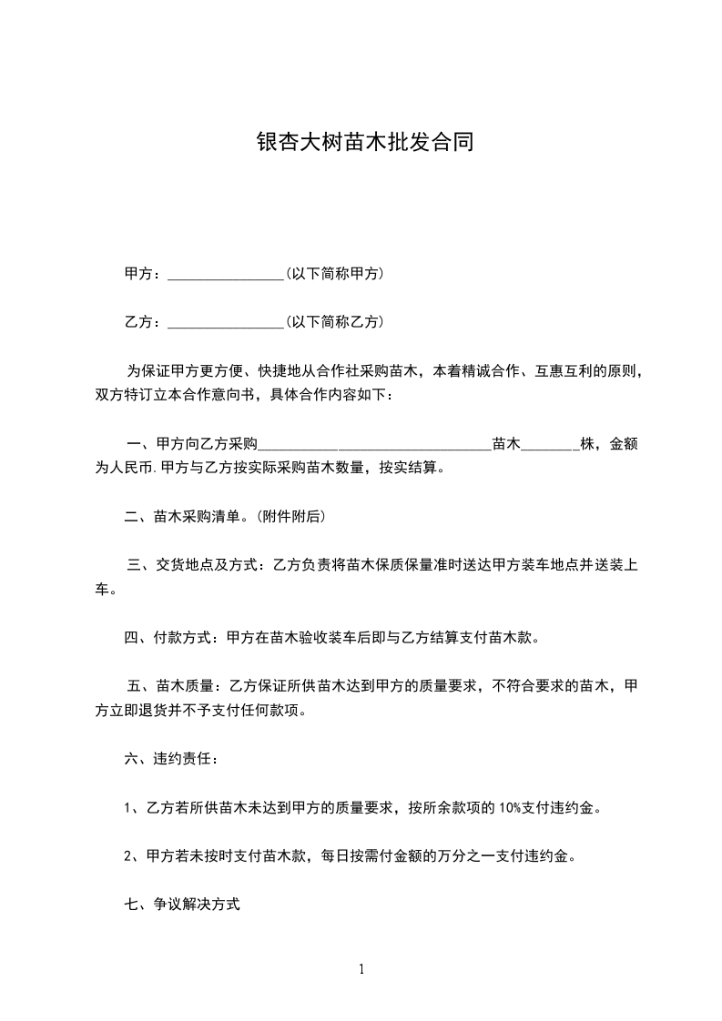 一、甲方向乙方采购________________________________苗木________株,金额为人民币.甲方与乙方按实际采购苗木数量,按实结算。