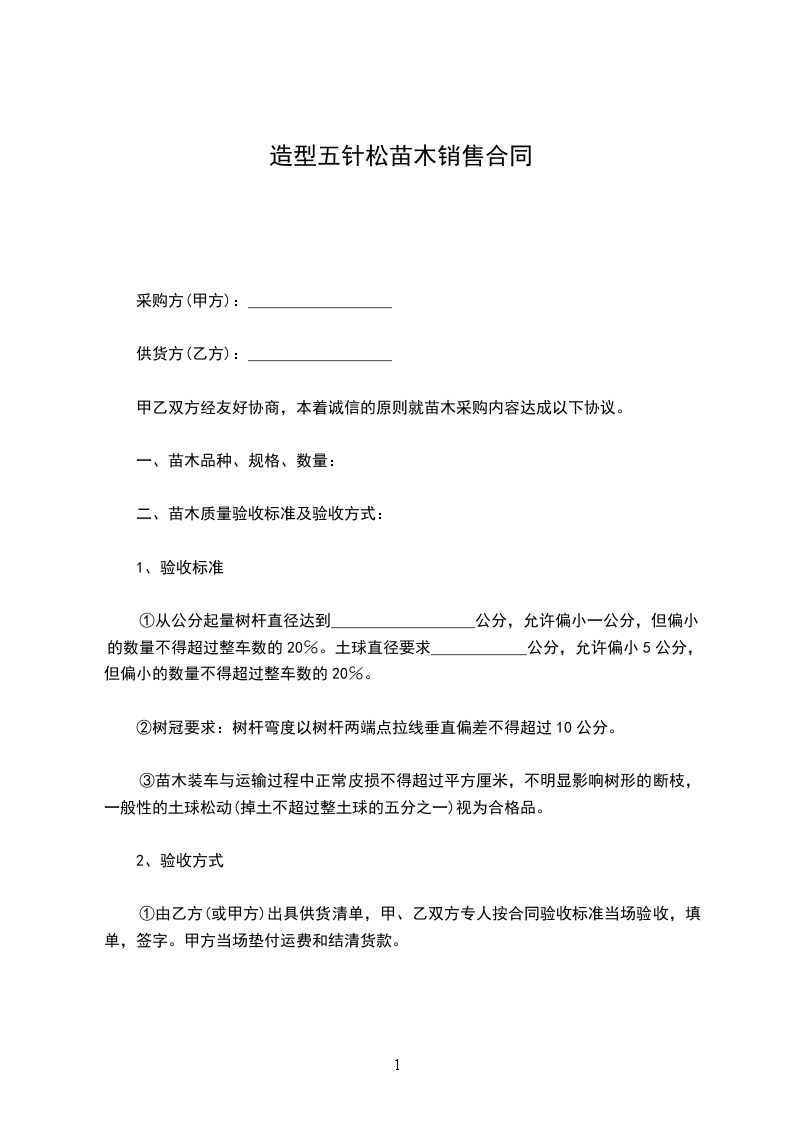一、根据乙方的需要,甲方组织保质保量的货源,由乙方在场地内自由选购发育正常的树苗,达到乙方满意。乙方购买______________(______________)株,______________(______________)株。(_____________________每株______________元,______________每株______________元)树苗共计_____________________元整。