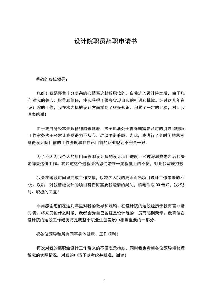 您好!我是怀着十分复杂的心情写这封辞职信的。自我进入设计院之后,由于您们对我的关心、指导和信任,使我获得了很多实现自我的机遇和挑战。经过这几年在设计院的工作,我在水力机械设计方面学到了很多知识、积累了一定的经验,对此我深表感谢!