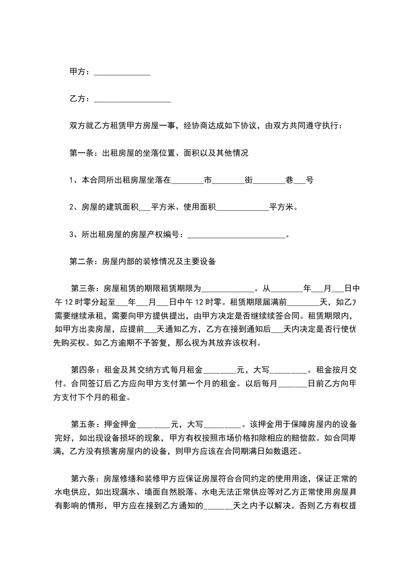 第九条:优先承租权租赁期间届满后,如甲方继续出租房屋,则乙方在同等条件下享有优先承租权。如租赁期间届满后,乙方确实无法找到房屋,甲方应给予一个月的宽限期,宽限期的房租与约定的房租一样。
