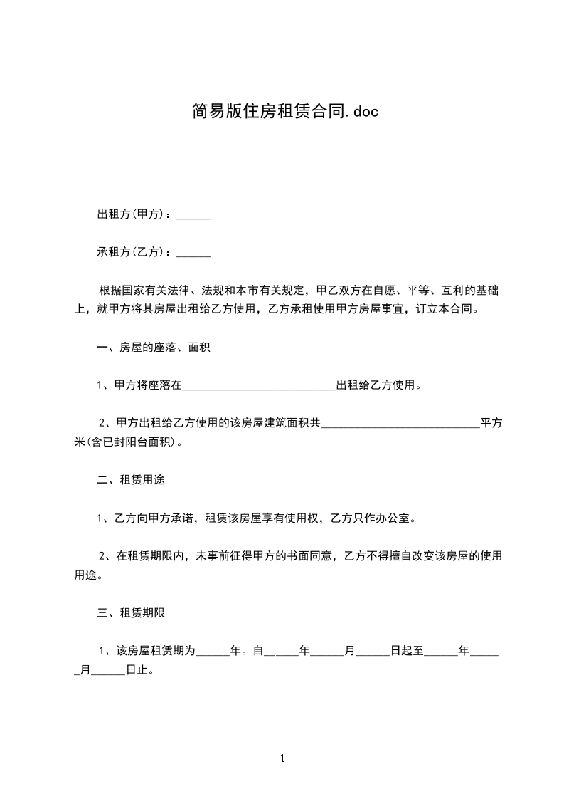 一、甲方将位于__________________租赁给乙方。甲方对所出租的房屋具有合法产权。