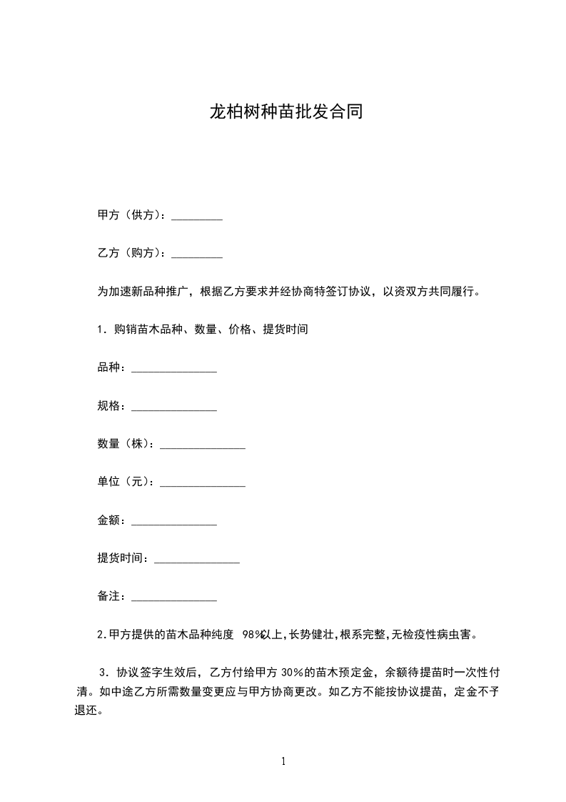 3.协议签字生效后,乙方付给甲方30%的苗木预定金,余额待提苗时一次性付清。如中途乙方所需数量变更应与甲方协商更改。如乙方不能按协议提苗,定金不予退还。