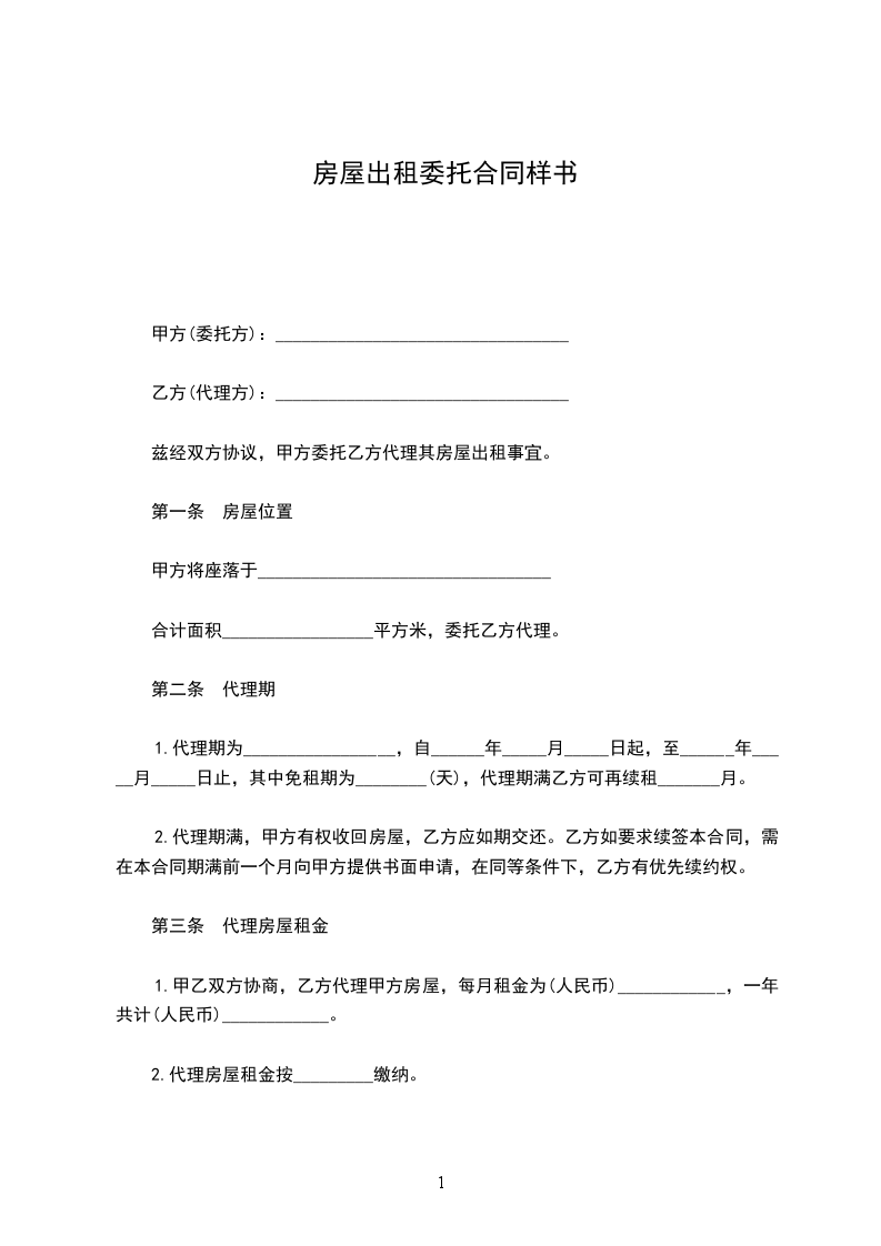 1.甲乙双方协商,乙方代理甲方房屋,每月租金为(人民币)____________,一年共计(人民币)____________。