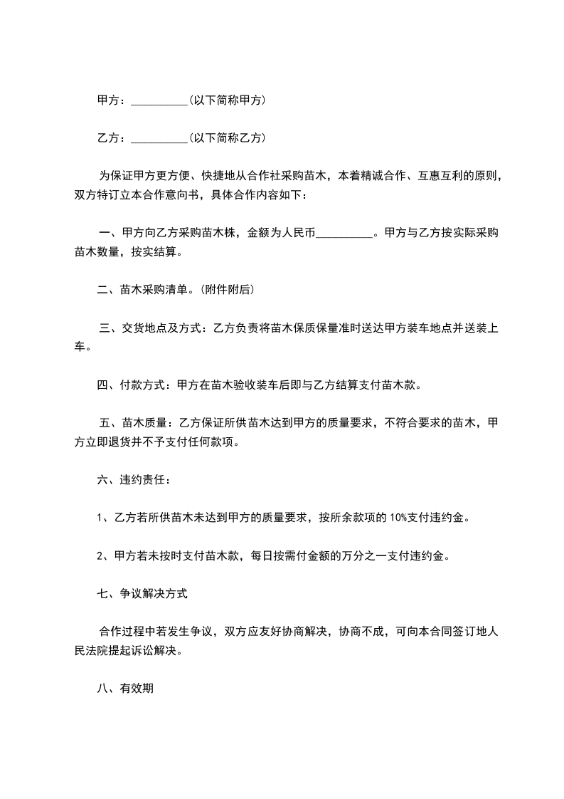 为保证甲方更方便、快捷地从合作社采购苗木,本着精诚合作、互惠互利的原则,双方特订立本合作意向书,具体合作内容如下: