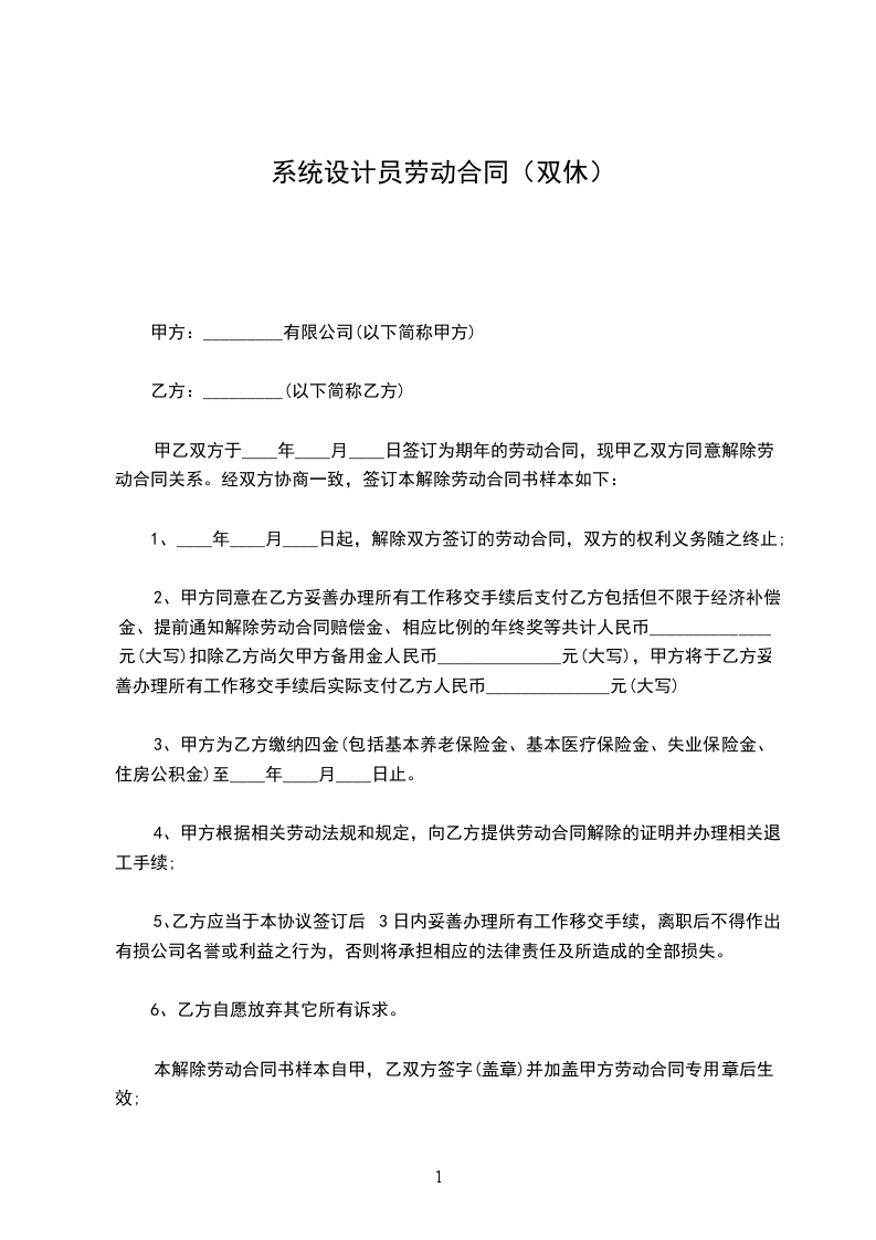 1、____年____月____日起,解除双方签订的劳动合同,双方的权利义务随之终止;