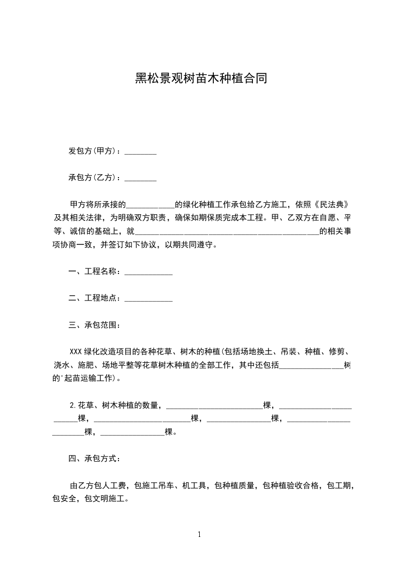 一、根据乙方的需要,甲方组织保质保量的货源,由乙方在场地内自由选购发育正常的树苗,达到乙方满意。乙方购买______________(______________)株,______________(______________)株。(_____________________每株______________元,______________每株______________元)树苗共计_____________________元整。