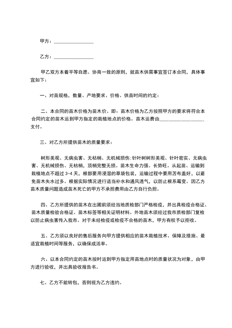 ②苗木长途运费由甲方支付,运货方需提供正规的运输发票。