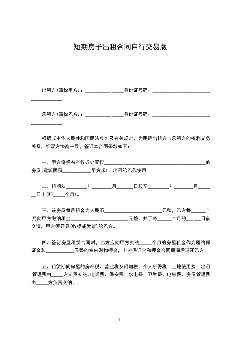 出租方(简称甲方):________________身份证号码:_____________________________________