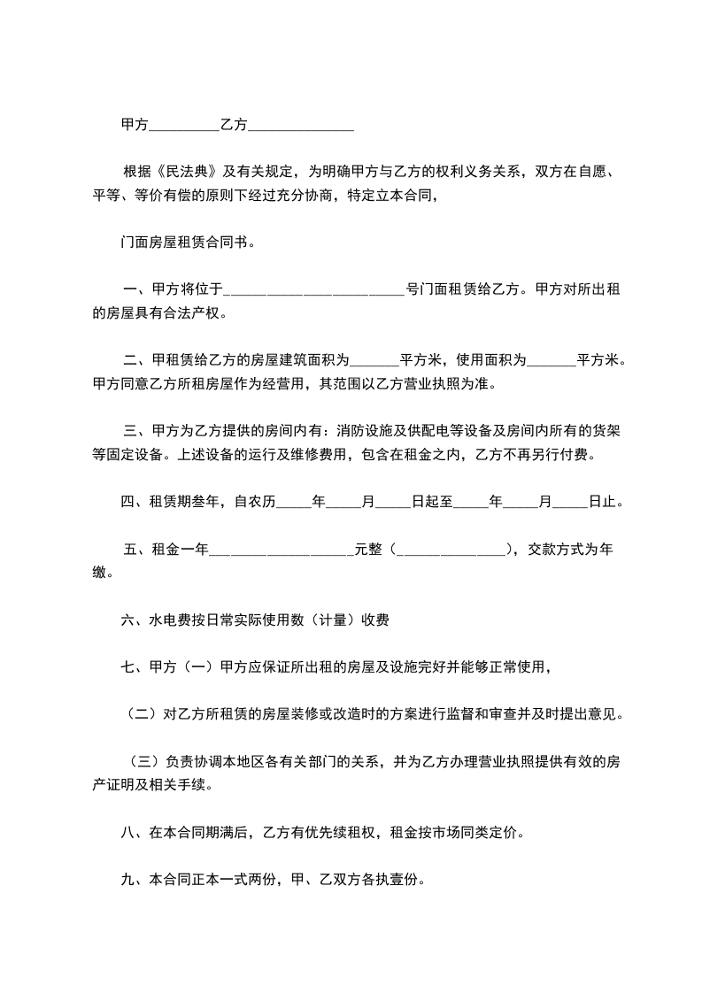 一、甲方将位于_________________________号门面租赁给乙方。甲方对所出租的房屋具有合法产权。