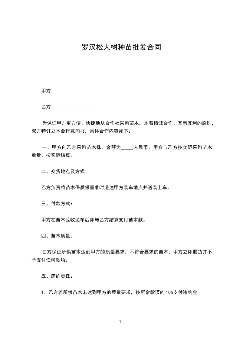 一、甲方向乙方采购苗木株,金额为_____人民币。甲方与乙方按实际采购苗木数量,按实际结算。
