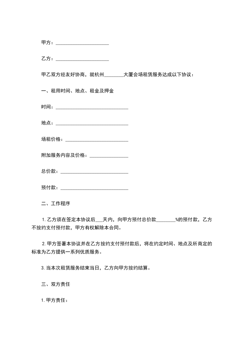 甲乙双方经友好协商,就杭州________大厦会场租赁服务达成以下协议: