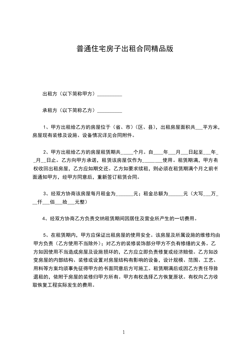 3、经双方协商该房屋每月租金为_______元;租金总额为______元(大写___万___仟___佰___拾___元整)