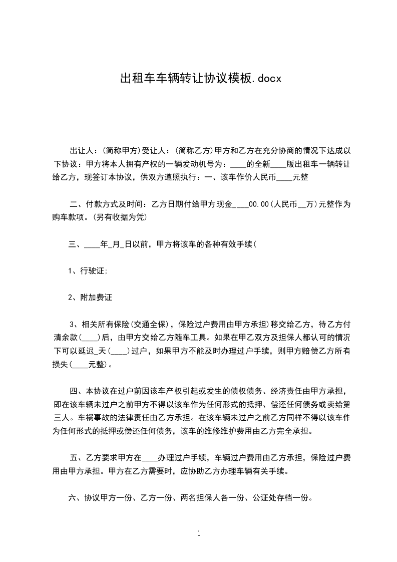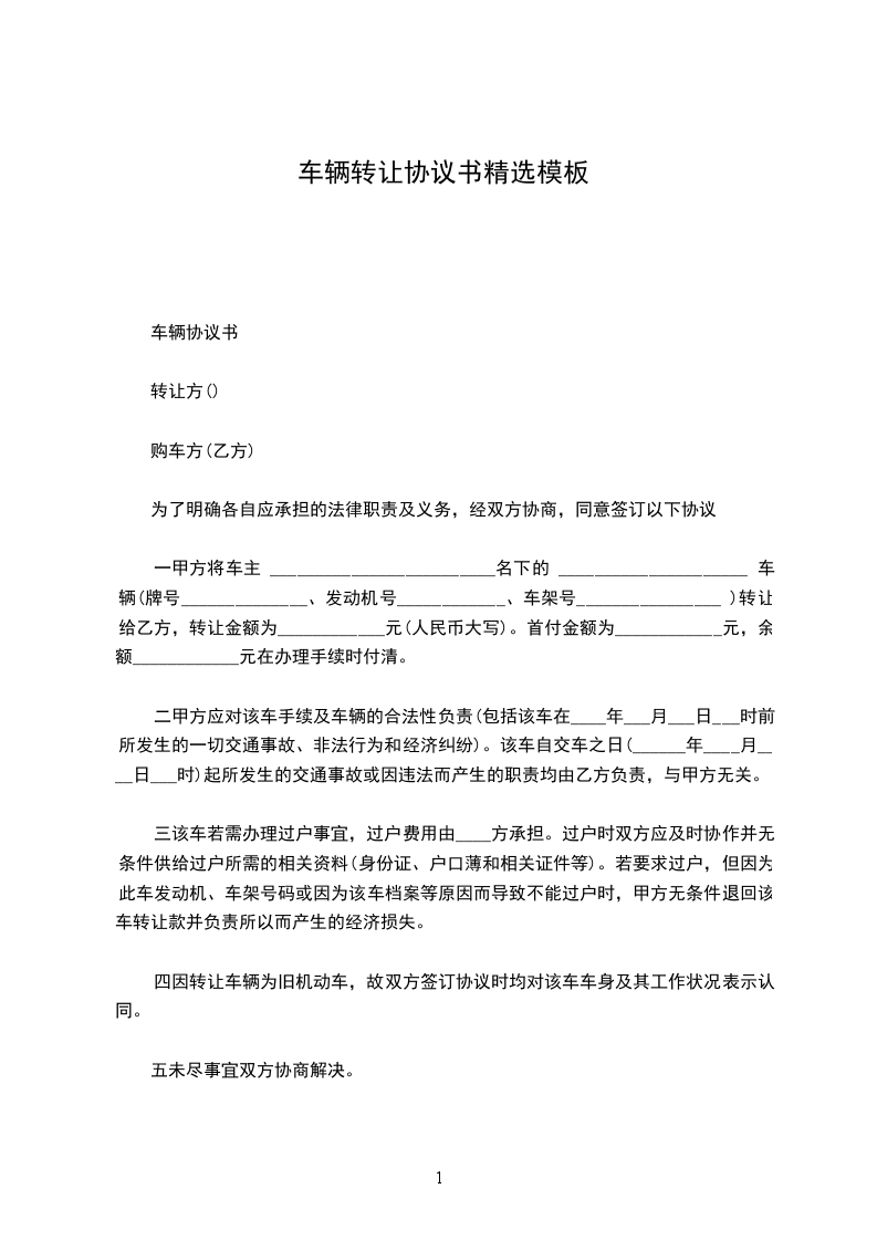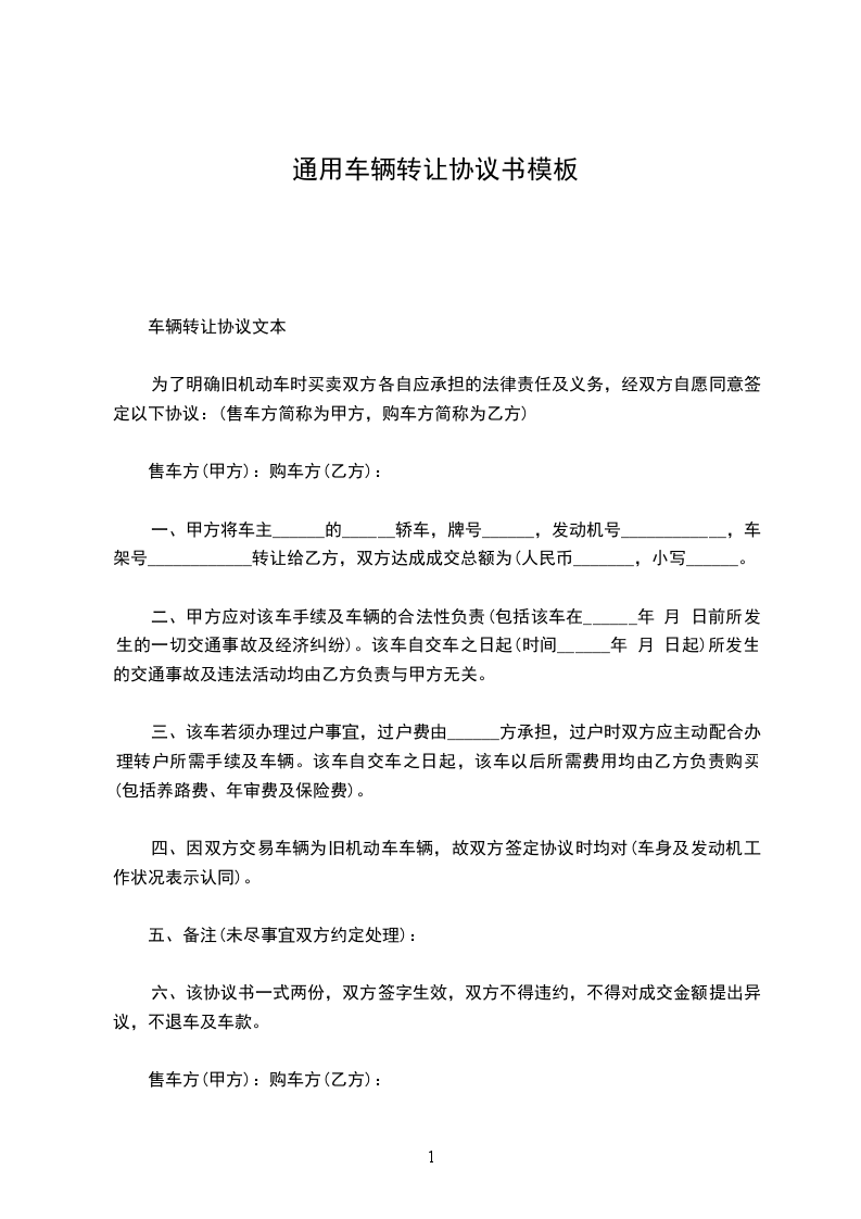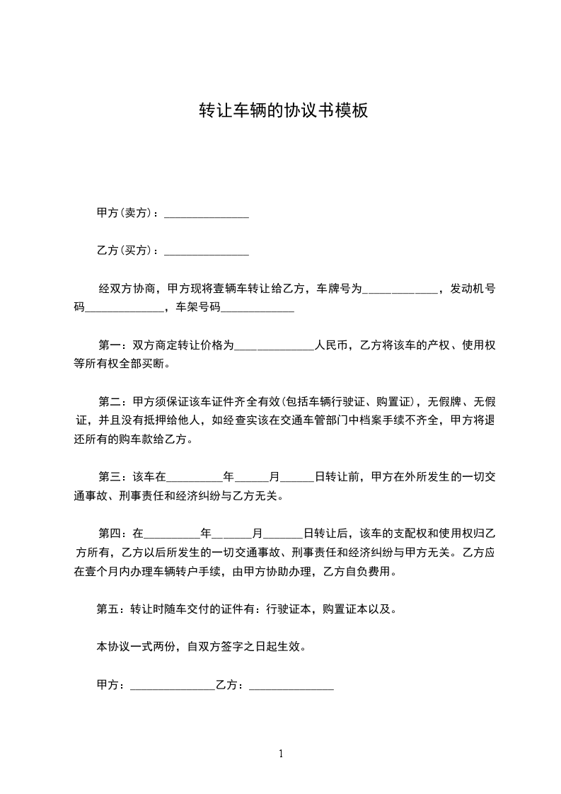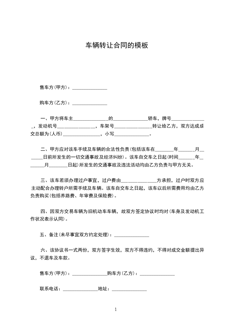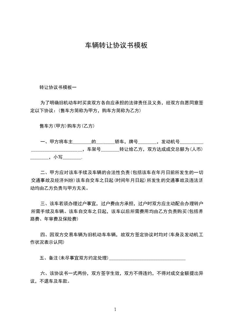 一、甲方将车主________的________轿车,牌号________,发动机号________________________________,车架号________转让给乙方,双方达成成交总额为(人币)________,小写________.