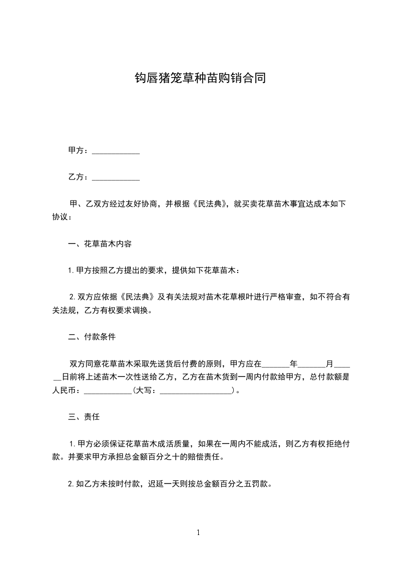 钩唇猪笼草种苗购销合同