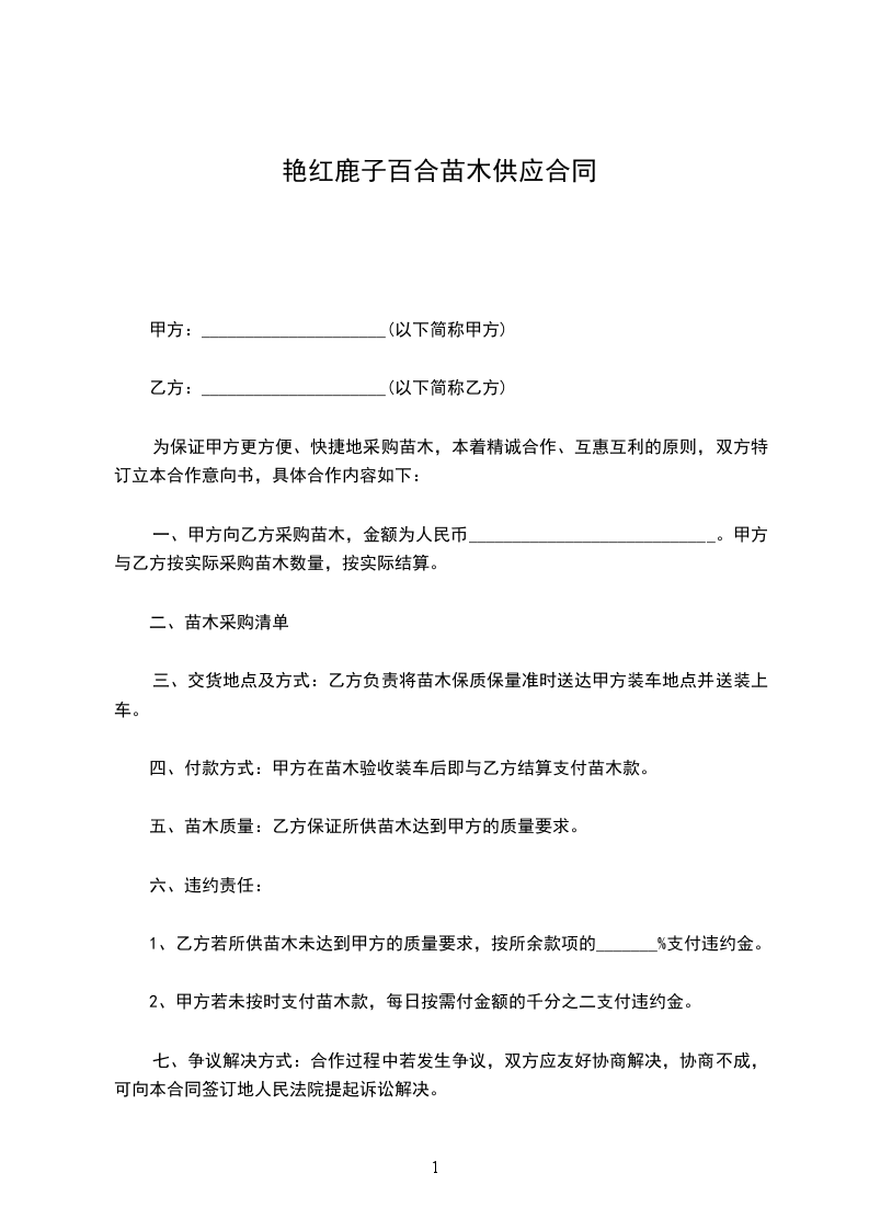 甲方在签订合同之日向乙方交付苗木订购款元,苗木运到甲方指定地点并且栽植完成后,甲方付给乙方元,剩余等到树苗成活率达到95%以上再付给乙方。