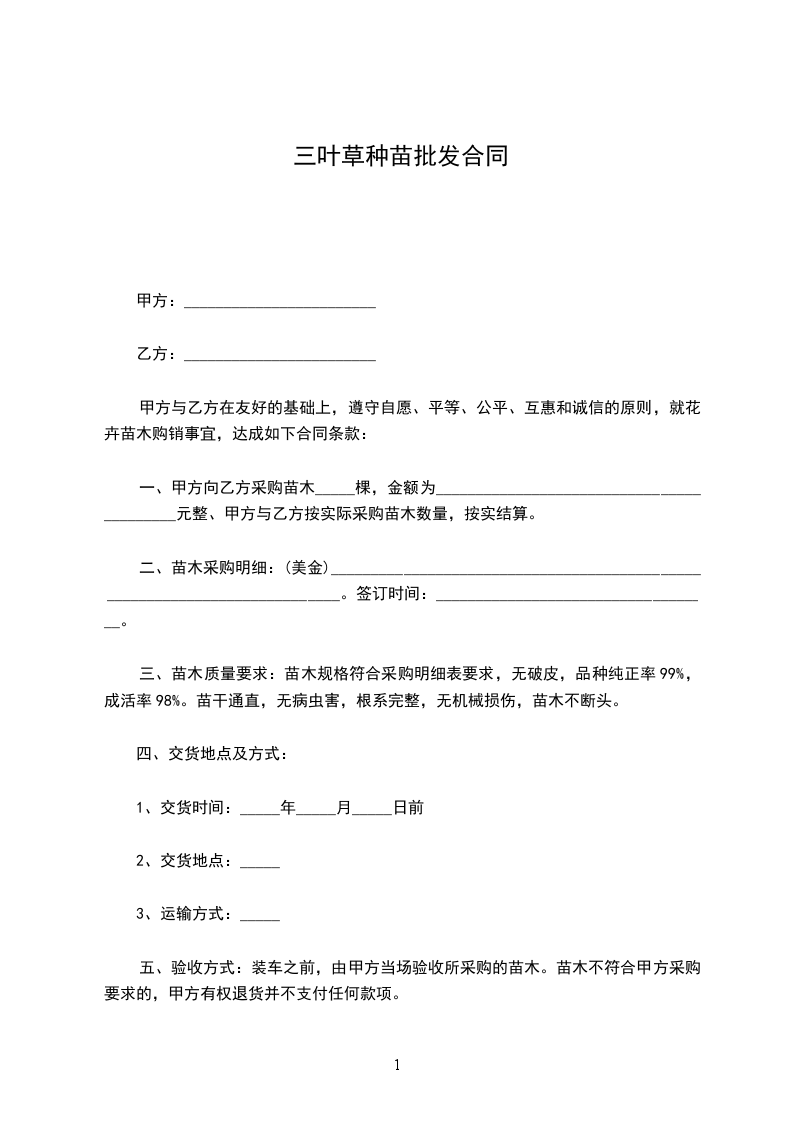 一、甲方向乙方采购苗木_____棵,金额为__________________________________________元整、甲方与乙方按实际采购苗木数量,按实结算。