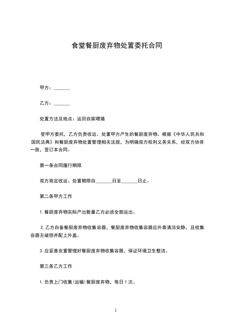 受甲方委托,乙方负责收运、处置甲方产生的餐厨废弃物。根据《中华人民共和国民法典》和餐厨废弃物处置管理相关法规,为明确双方权利义务关系,经双方协商一致,签订本合同。