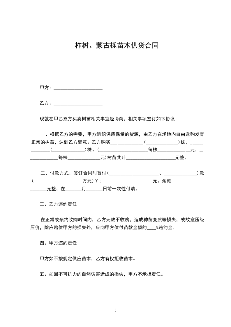 一、根据乙方的需要,甲方组织保质保量的货源,由乙方在场地内自由选购发育正常的树苗,达到乙方满意。乙方购买______________(______________)株,______________(______________)株。(_____________________每株______________元,______________每株______________元)树苗共计_____________________元整。