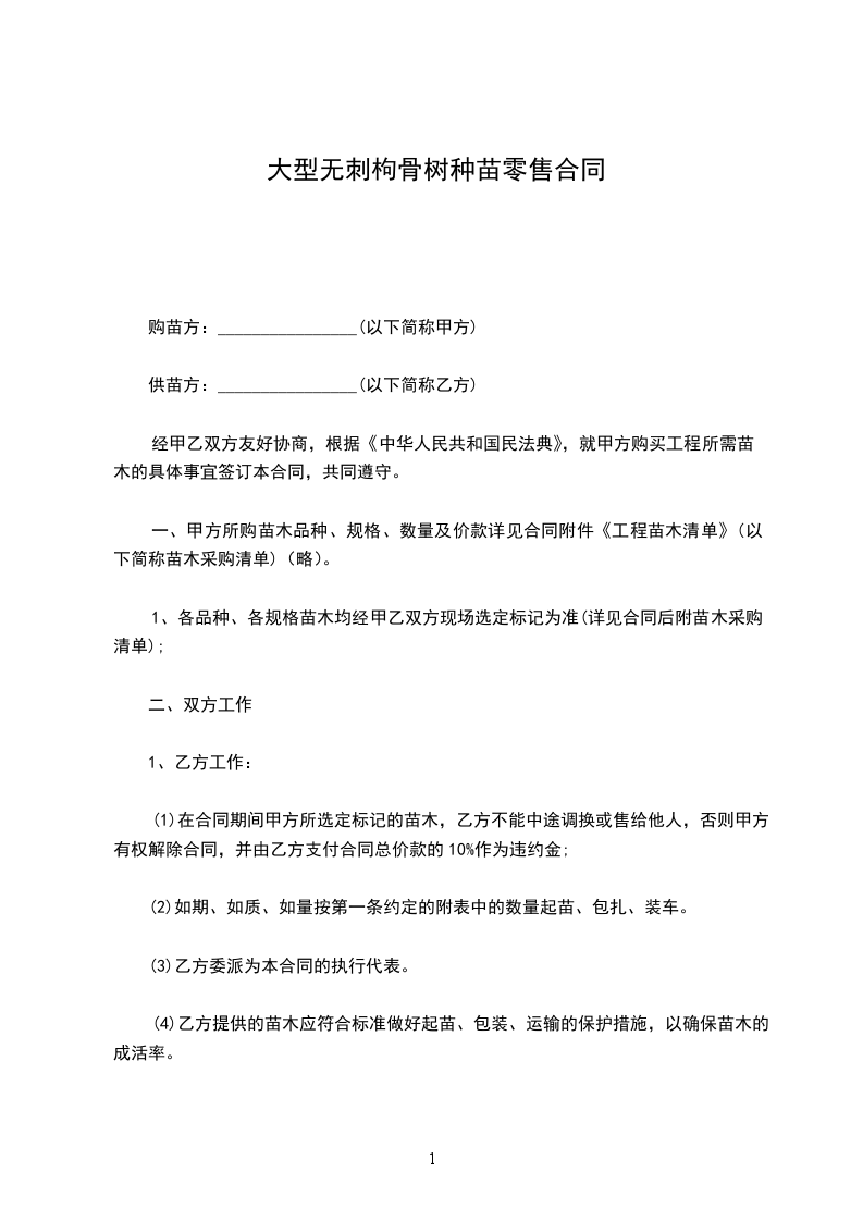 (1)在合同期间甲方所选定标记的苗木,乙方不能中途调换或售给他人,否则甲方有权解除合同,并由乙方支付合同总价款的10%作为违约金;
