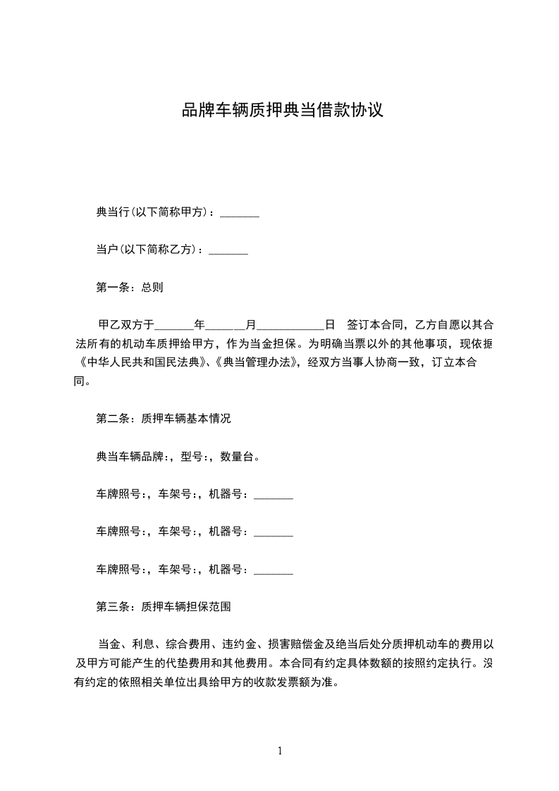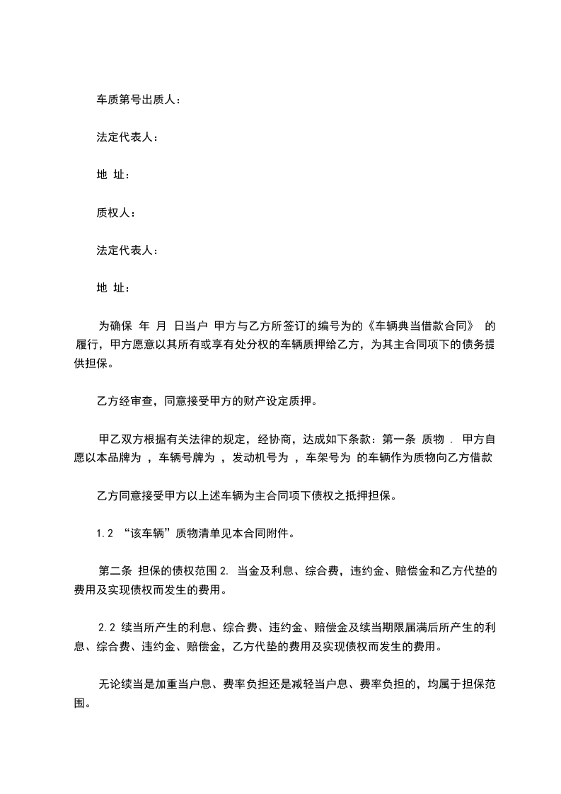 1.1甲方自愿以(型号、数量、单位)机动车(行驶证号码发动机号码)作为质押物向乙方申请典当借款。乙方同意接受甲方以上述车辆为本合同项下债权之担保,甲方与乙方可就担保的具体事项另行签订质押合同。