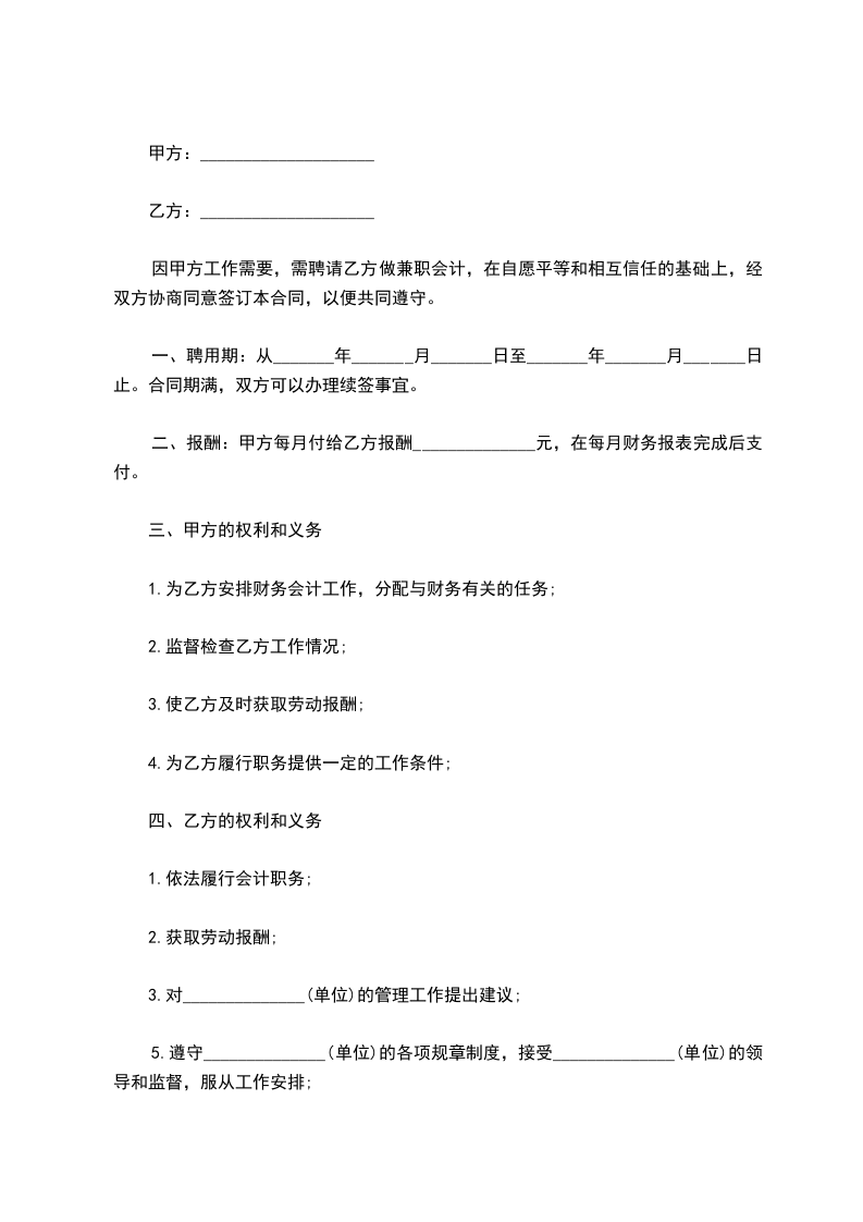 二、报酬:甲方每月付给乙方报酬______________元,在每月财务报表完成后支付。
