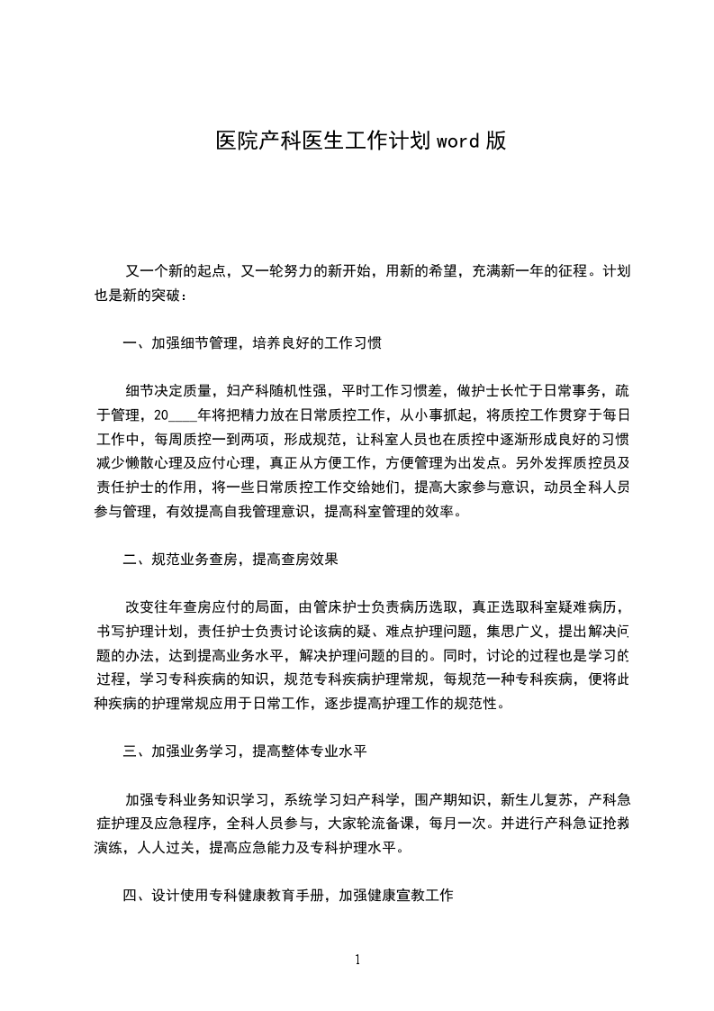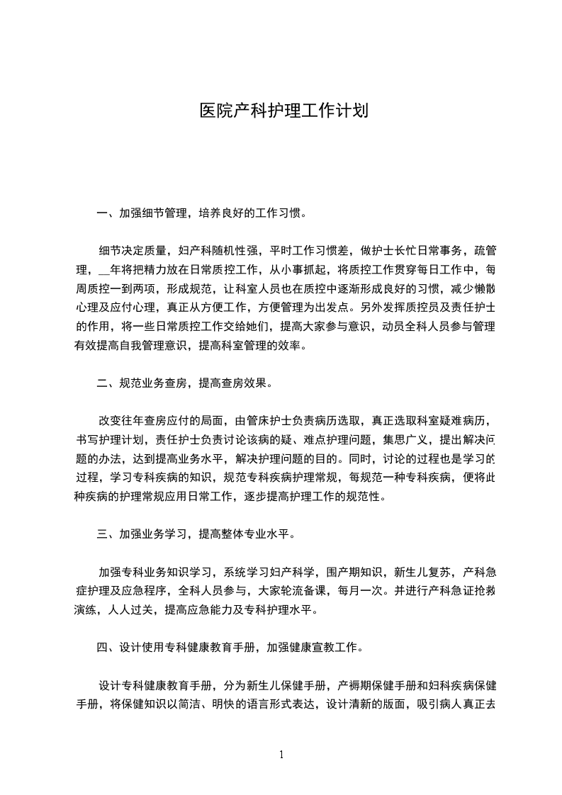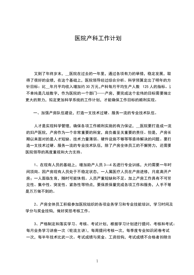 又到了年终岁末,__医院在过去的一年里,通过各项有力的举措,稳定发展,取得了很好的业绩,在这个基础上,医院领导经过综合分析、科学预算定出了明年的方针目标:比__年月平均收入增加约30万元,产科每月平均生产人数125人的指标。这不单纯是几组数字,作为医院的一个部门——产房,要完成这个宏伟的目标需要做出更大的努力,拟定更加科学系统的工作计划,才能确保工作目标的顺利实现。