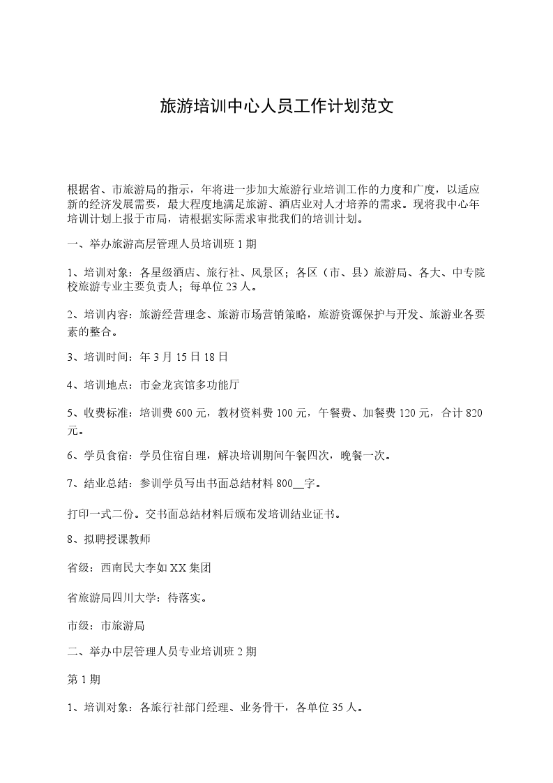 根据省、市旅游局的指示,年将进一步加大旅游行业培训工作的力度和广度,以适应新的经济发展需要,最大程度地满足旅游、酒店业对人才培养的需求。现将我中心年培训计划上报于市局,请根据实际需求审批我们的培训计划。