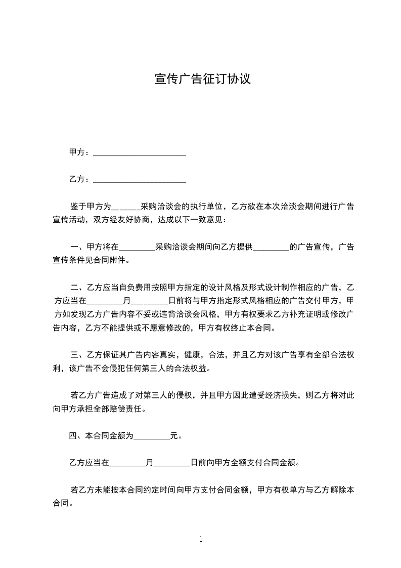 一、甲方将在_________采购洽谈会期间向乙方提供_________(类型)的广告宣传,广告宣传条件见合同。