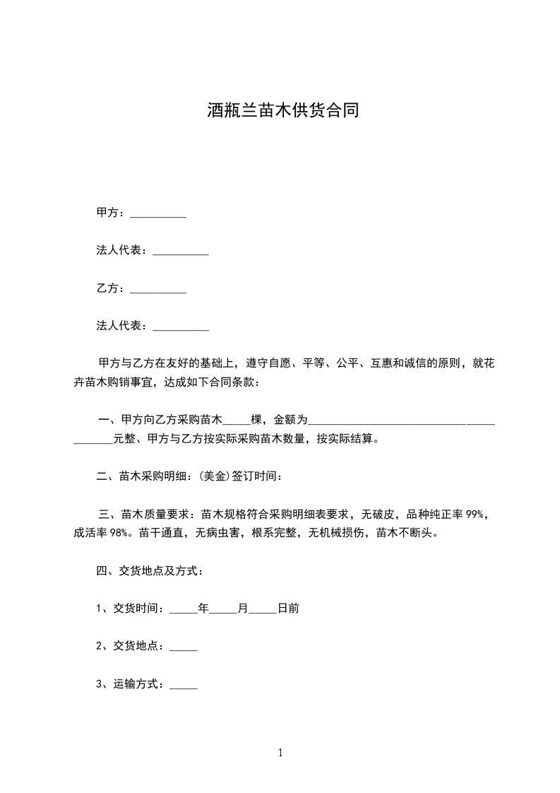 一、甲方向乙方采购苗木_____棵,金额为________________________________________元整、甲方与乙方按实际采购苗木数量,按实际结算。