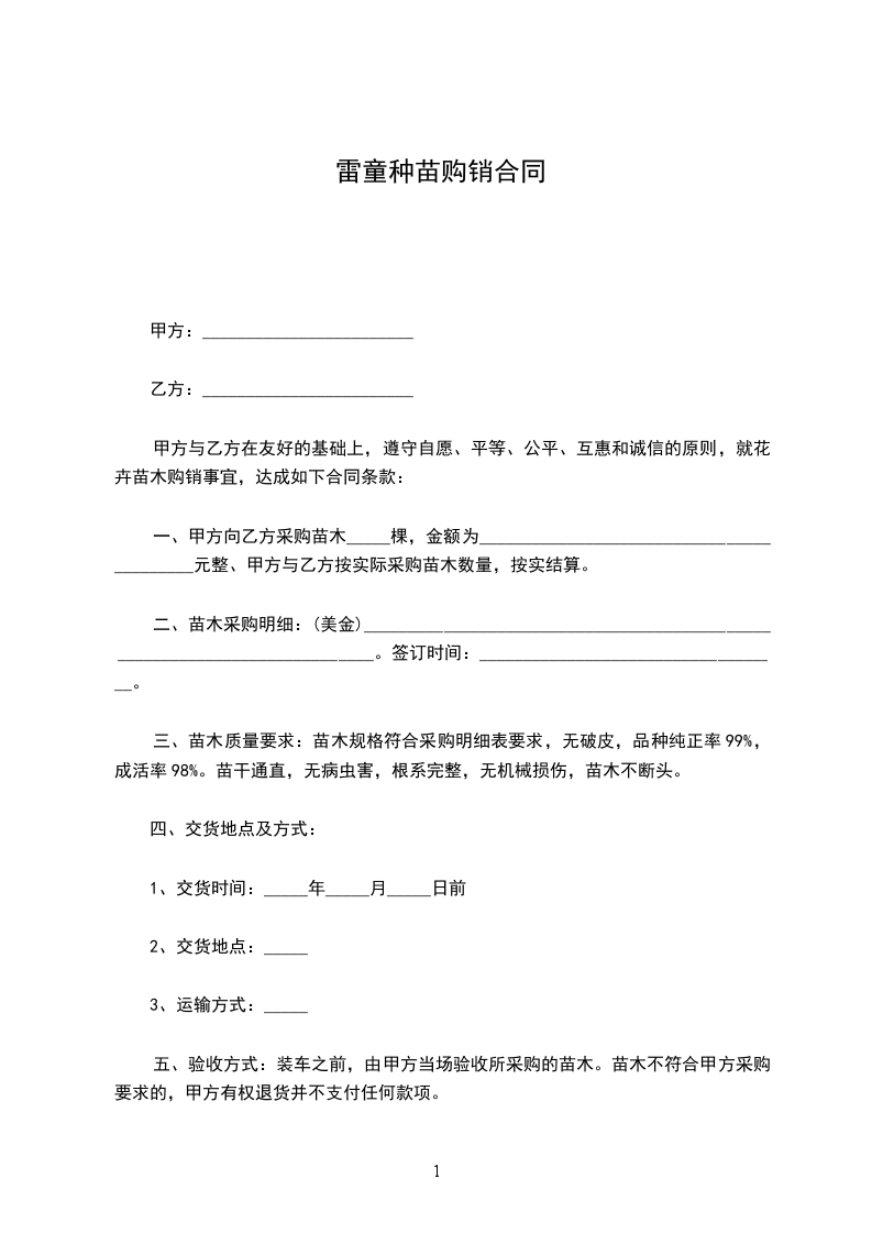 一、甲方向乙方采购苗木_____棵,金额为__________________________________________元整、甲方与乙方按实际采购苗木数量,按实结算。