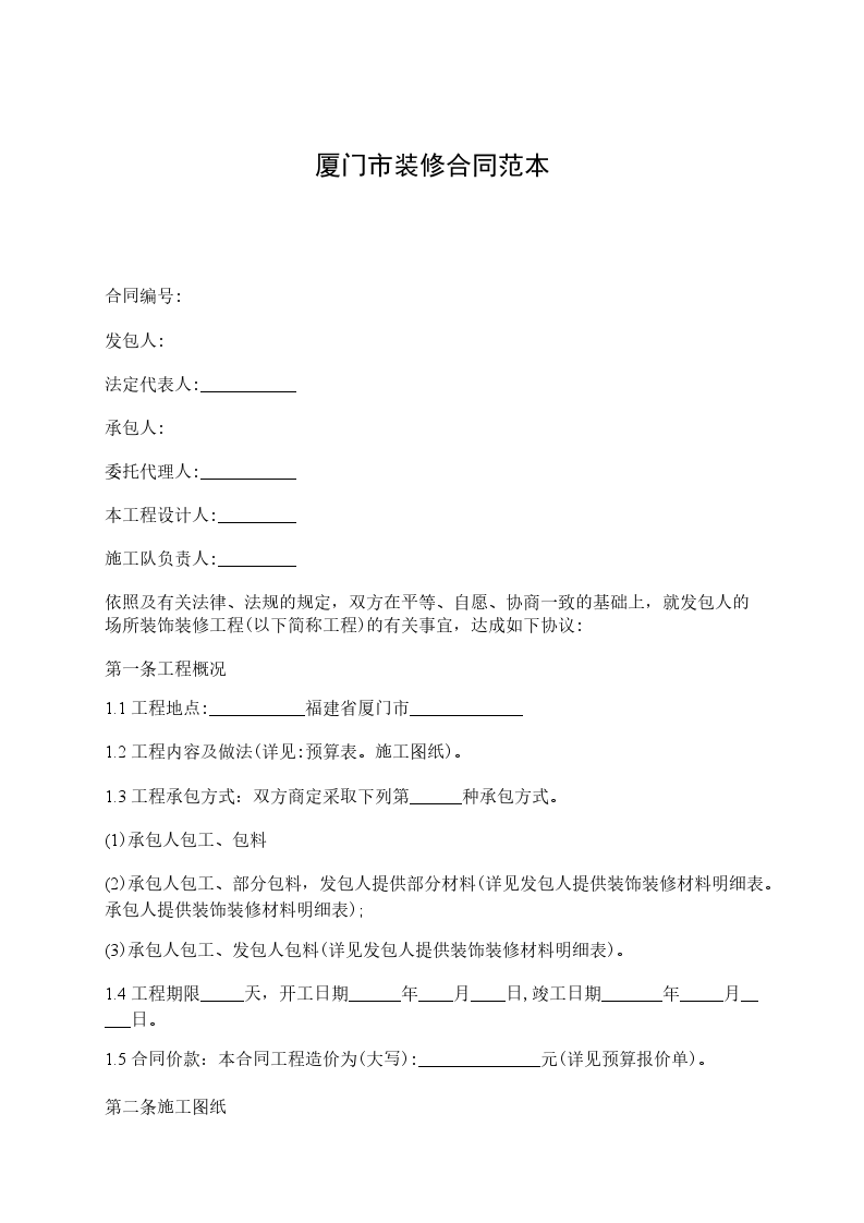 (1)发包人自行设计并提供施工图纸,图纸一式二份,发包人、承包人各一份(详见:装饰装修工程设计图纸);