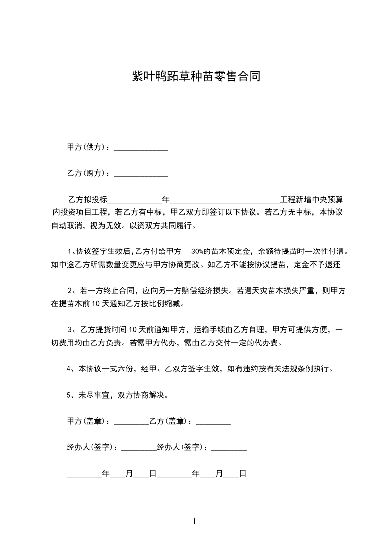 1、协议签字生效后,乙方付给甲方30%的苗木预定金,余额待提苗时一次性付清。如中途乙方所需数量变更应与甲方协商更改。如乙方不能按协议提苗,定金不予退还。