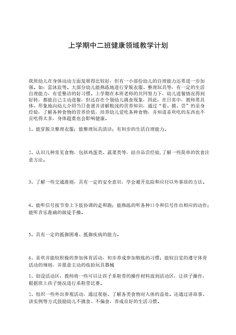 1、能穿脱及整理衣服;能整理玩具清洁;有初步的生活自理能力。2、认识几种常见食物,包括鸡蛋类、蔬菜类等,结合品尝经验,了解一些简单的饮食注意方法。3、了解一些交通准则,具有一定的安全意识,学会避开危险和应付以外事故的方法。4、能听信号按节奏上下肢协调的走和跑;能熟练的听各种口令和信号作出相应的动作;能听音乐准确的做徒手操。5、具有一定的抵御困难、抵御疾病的能力。6、喜欢并能较积极的参加体育活动,初步养成参加锻炼的习惯;能较自觉的遵守体育活动的规则,并愿意主动的收拾玩具器械