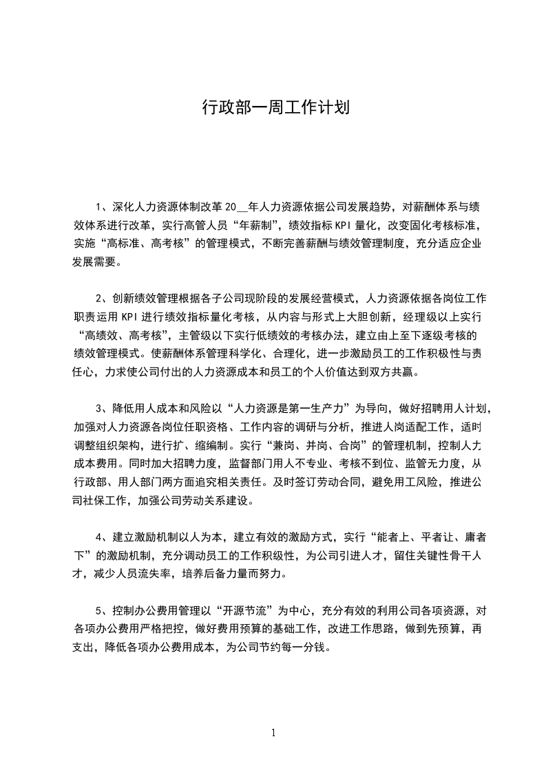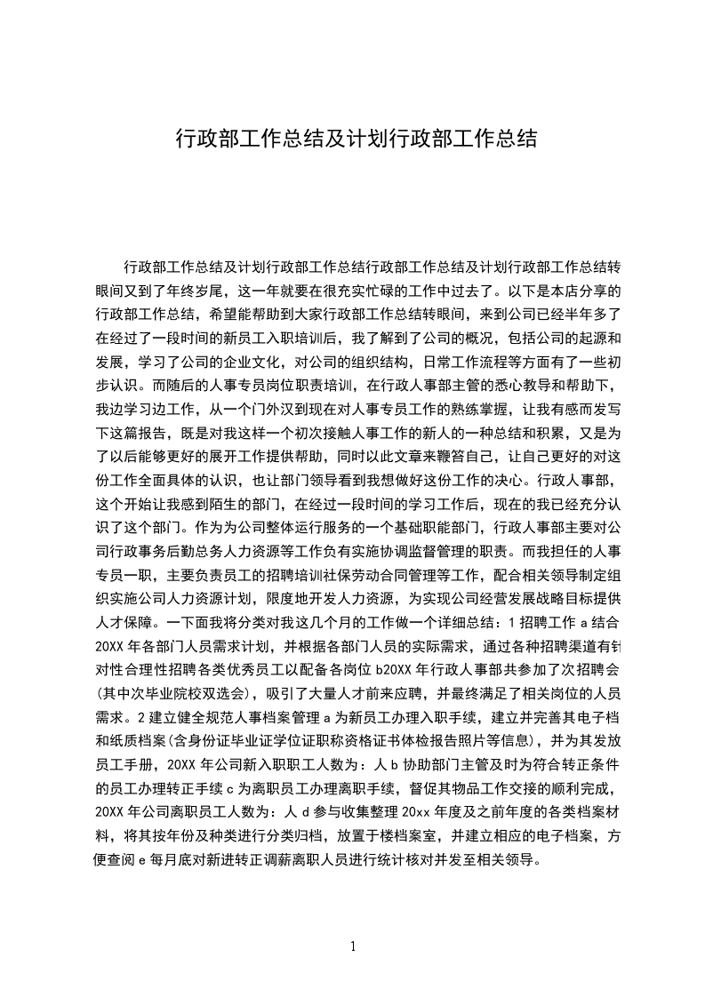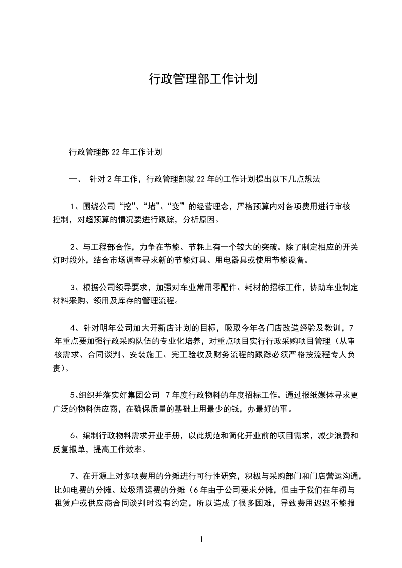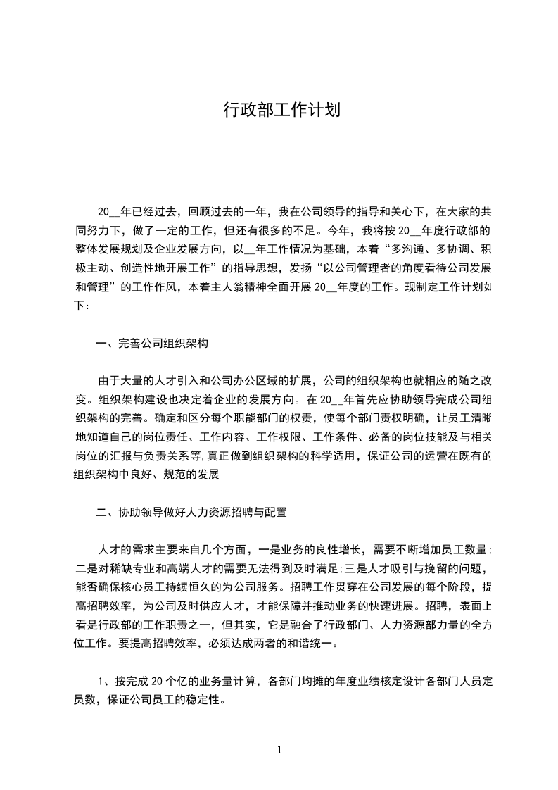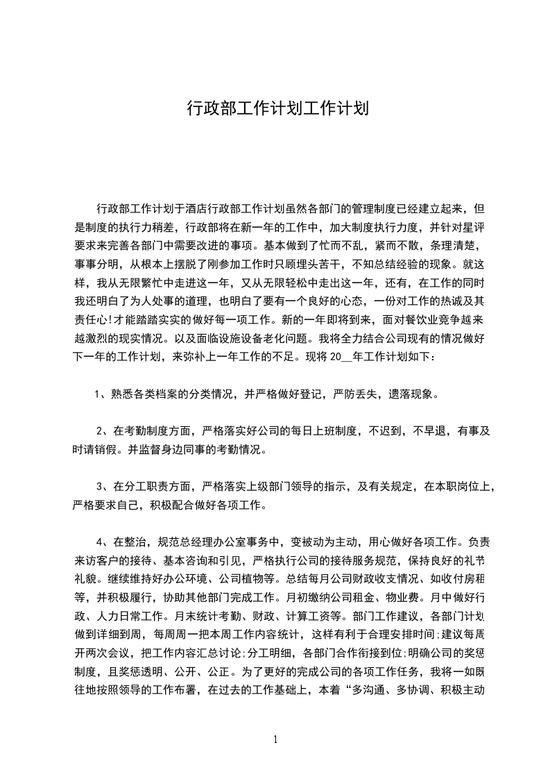 20__年已经过去,回顾过去的一年,我在公司领导的指导和关心下,在大家的共同努力下,做了一定的工作,但还有很多的不足。今年,我将按20__年度行政部的整体发展规划及企业发展方向,以__年工作情况为基础,本着“多沟通、多协调、积极主动、创造性地开展工作”的指导思想,发扬“以公司管理者的角度看待公司发展和管理”的工作作风,本着主人翁精神全面开展20__年度的工作。现制定工作计划如下: