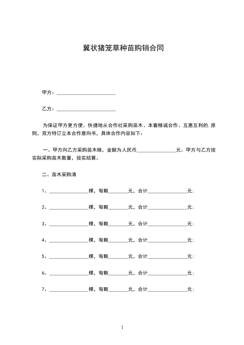 一、甲方向乙方采购苗木株,金额为人民币________________元。甲方与乙方按实际采购苗木数量,按实结算。